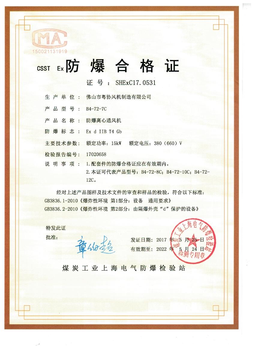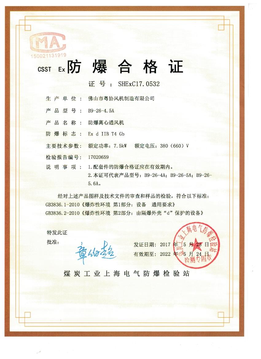 好消息!佛山粵協風機廠家生產的防爆離心通風機,高壓防爆離心通風機,獲得防爆證書。本證可代表產品型號:B4-72-8C、B4-72-10C、B4-72-12C。 B9-26-4A、B9-26-5A、B9-26-5.6A。表示粵協風機廠家的防爆離心通風機產品質量符合國家相關規(guī)定,穩(wěn)定性、可靠性。