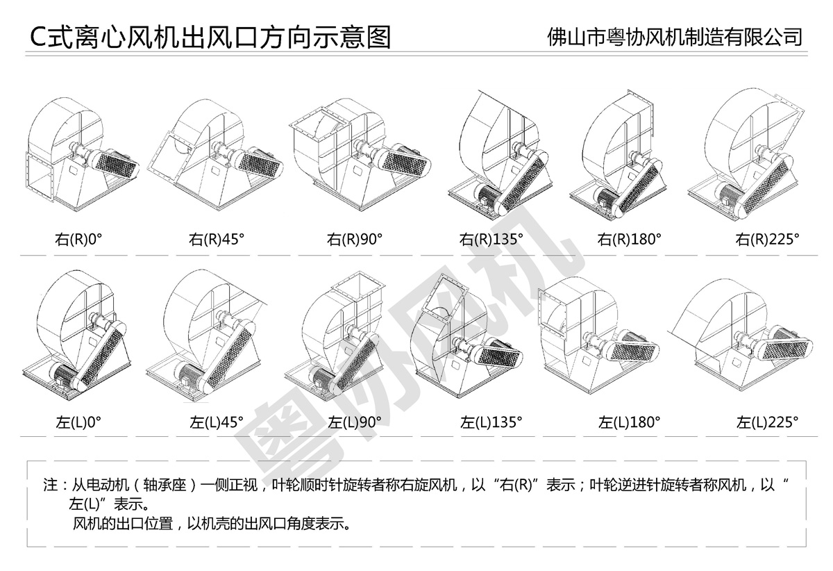 離心風(fēng)機(jī)可制成右旋和左旋兩種型式。從電機(jī)一端正視,葉輪順時(shí)針旋轉(zhuǎn)者稱右旋風(fēng)機(jī),以“右”表示,反之稱左旋風(fēng)機(jī),以“左”表示。