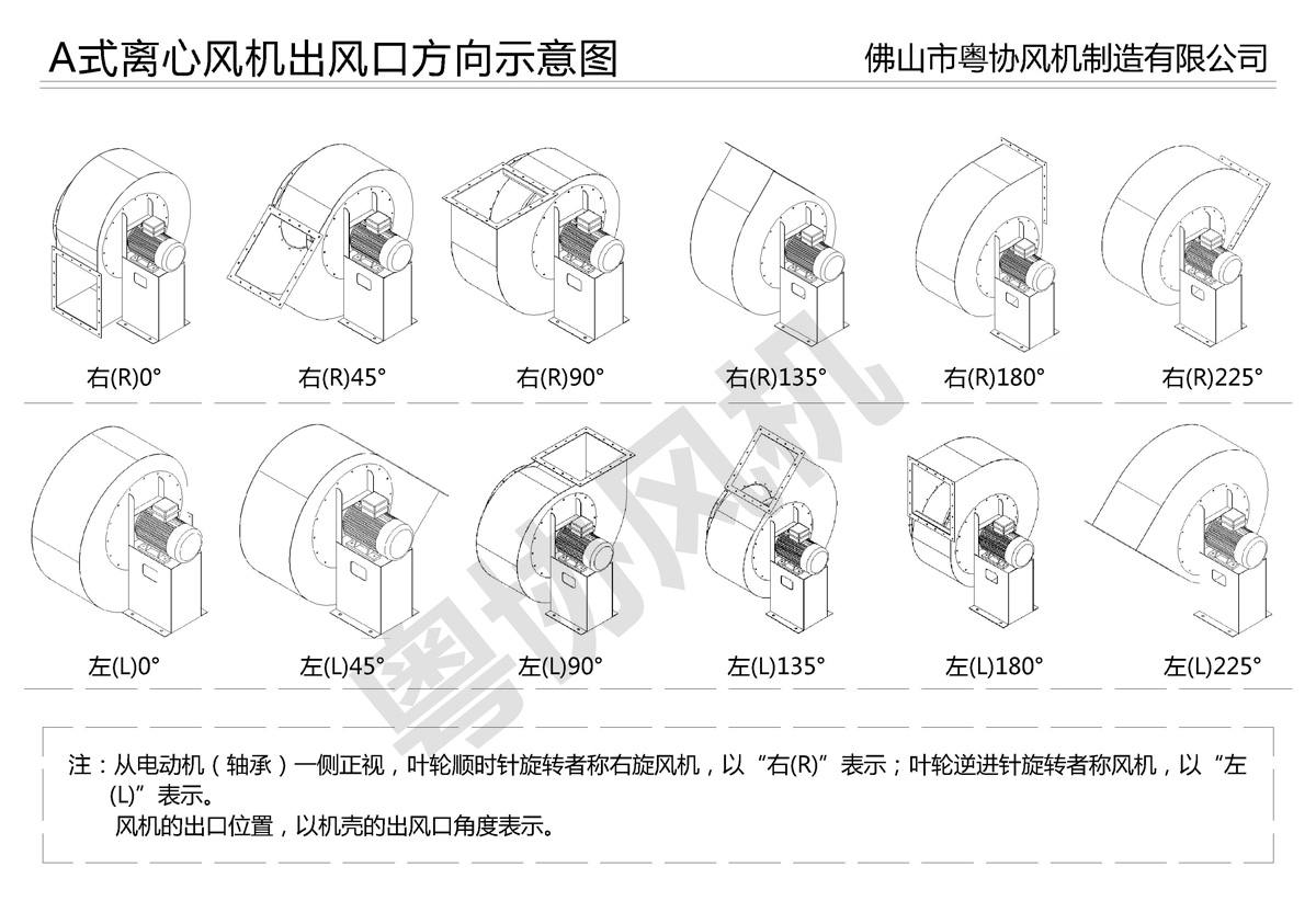 離心通風(fēng)機(jī)可制成逆時(shí)針旋轉(zhuǎn)和順時(shí)針旋轉(zhuǎn)兩種型式。葉輪順時(shí)針旋轉(zhuǎn)者稱順時(shí)旋風(fēng)機(jī),以“順”表示,反之稱逆旋風(fēng)機(jī),以“逆”表示。